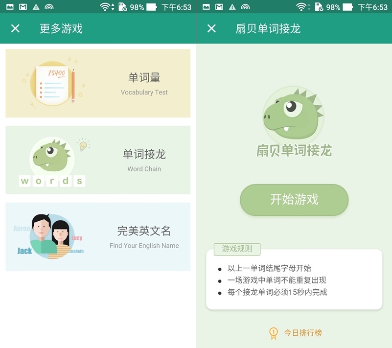 還有像單詞接龍這種小遊戲,考驗 15 秒內接龍且不重複不拼錯字詞。
