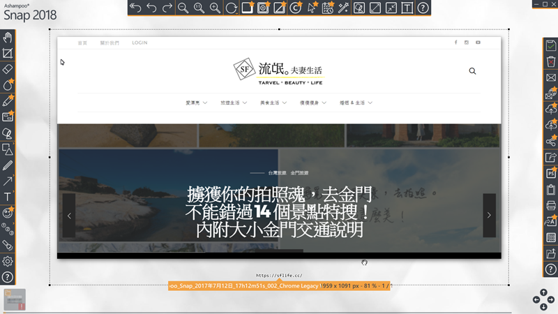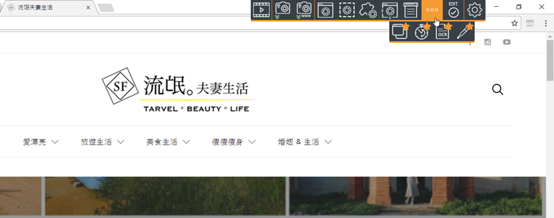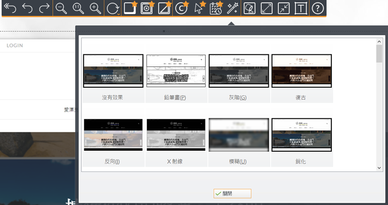 先來用基本的擷取網頁,滑鼠左鍵按下去就完成截圖,然後會自動開啟程式,上排主要是調整大小,左邊主要是加入形狀、圖案、線條、油漆桶等編輯功能,右排就是傳送、列印等輸出方式,星號一樣是升級版才有,但也很夠用了。