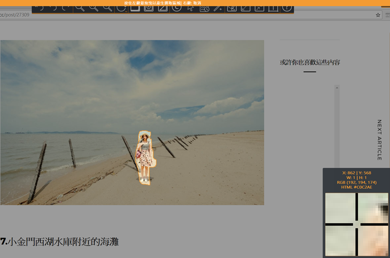 擷取區域除了矩形、圓形等形狀,也能利用左鍵拖曳產生不規則的區塊。