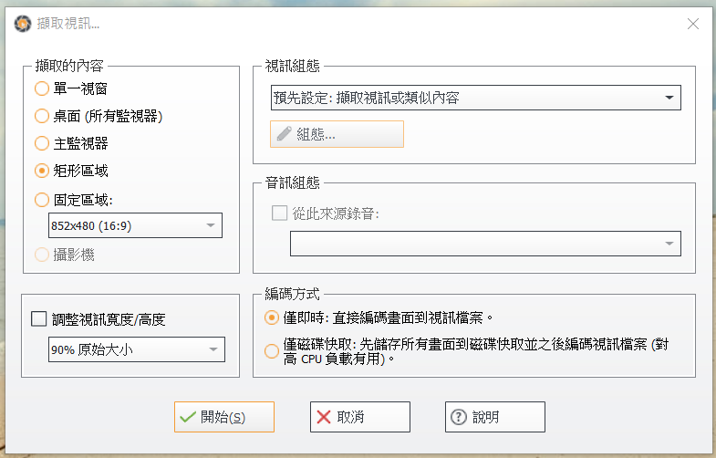 再來就是擷取視訊的功能,內容可用單一視窗、桌面、自訂區域,視訊大小、組態也能調整。