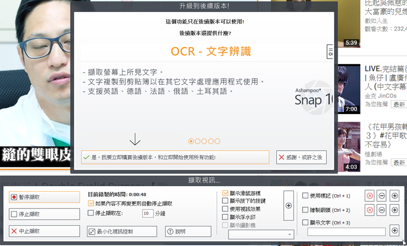 例如要擷取 YouTube 的影片,可用矩形選取影片區域,再按下方功能區的「開啟擷取」,可自行設定停止時間,並視需求選擇要顯示的按鈕及標記文字。