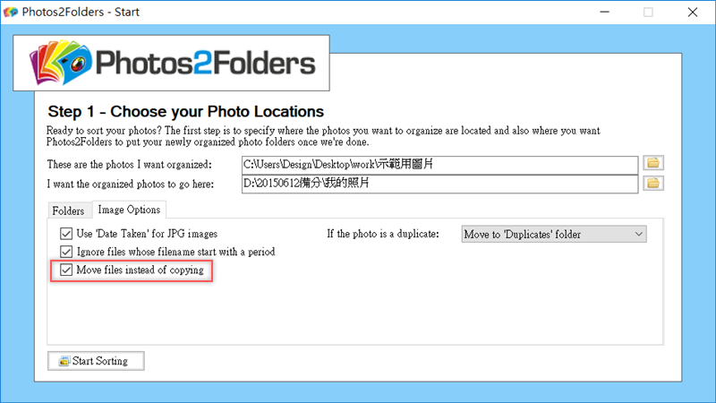 切換到旁邊的選項,有關於使用日期的認定、重複照片的處理,其中「Move files instead of copying」這條,如果相片沒做好備份最好取消勾選,這樣就會幫你用「複製」的方式處理原始資料夾,決定後就點「Start Sorting」。
