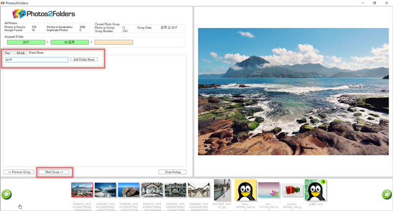 大概花個幾秒就分析出來,因為阿湯設的資料夾第三層是名稱(也可以不設第三層),所以當程式判定第一批照片為 2017 → 05 - 五月,接著就是自訂的名稱,輸入後點下面「Next Group」。