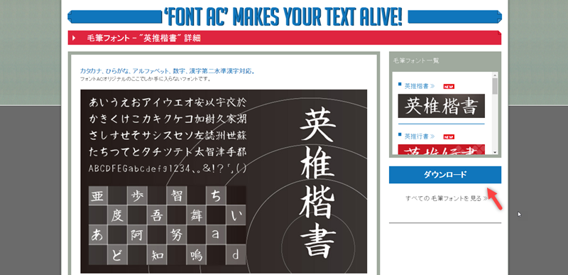 來看看書法風,滑鼠移到字型上就會顯示簡介,可以先看適不適合再點進去,像這套英推楷書在簡介就標明可用於個人或商業。