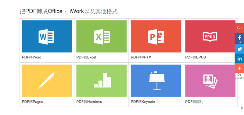 Smallpdf 一樣繁體中文頁面,色彩鮮艷點區塊即可使用,沒有任何限制。