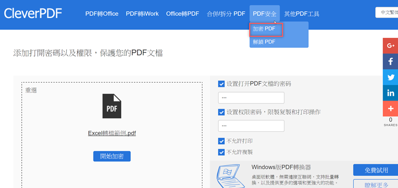 除了與 Office 檔案間的轉換,合併、拆分、解鎖、加密也是必備的,像加密功能除了可設開啟密碼,列印、複製的權限也能設定。