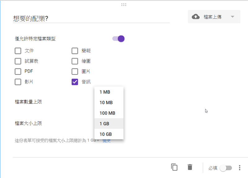 接著可以設定檔案類型(或不設定),共有文件、試算表、PDF 等八種類型可選擇,阿湯選音訊,檔案數量上限只有 1、5、10 可選,無法自訂。