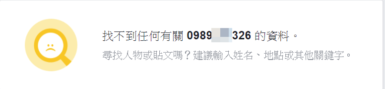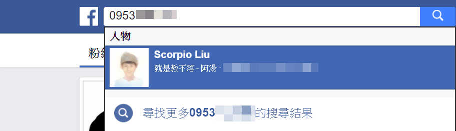 首頁 › 網路社群 › Facebook 加朋友新招數,輸入電話號碼來搜尋用戶 Facebook 加朋友新招數,輸入電話號碼來搜尋用戶 發佈日期:2017/7/29 作者:阿湯 分類:網路社群 大家用臉書都是怎麼加好友的呢?通常都是輸入名稱或 Email 搜尋,找不到的話還要確認是不是哪個地方打錯(有時候連本人都不確定自己登記的 Email),不然就是從共同好友名單裡面找,最近阿湯發現有一個更快的方法,只要在搜尋列輸入電話號碼,就可以找到使用這個號碼認證的用戶,非常方便,不只加好友能用,如果想知道誰的 FB 帳號也可以用這方式找找看。 如何用電話號碼找人? 在左上角搜尋列輸入電話號碼同時就會顯示出來,非常快。 但如果對方的帳戶沒有綁定電話號碼就會搜尋不到,像阿湯是輸入一個根本沒在用臉書的長輩,果然真的沒帳號(原本想偷查看看的說)。 點查看更多結果就會提示你用其他方式來找人,不過學會這招了,就可以找到一些不給 FB 的人,就算不給加也能偷看公開的訊息,例如同事啊、想追求的學妹之類。