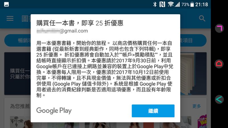 Google Play 又推 25 折買書優惠囉!用戶只要點進 Google Play 「圖書」中就會看見首頁上方出現 25 折優惠的活動圖示,而要購買的方式也相當的簡單,就是