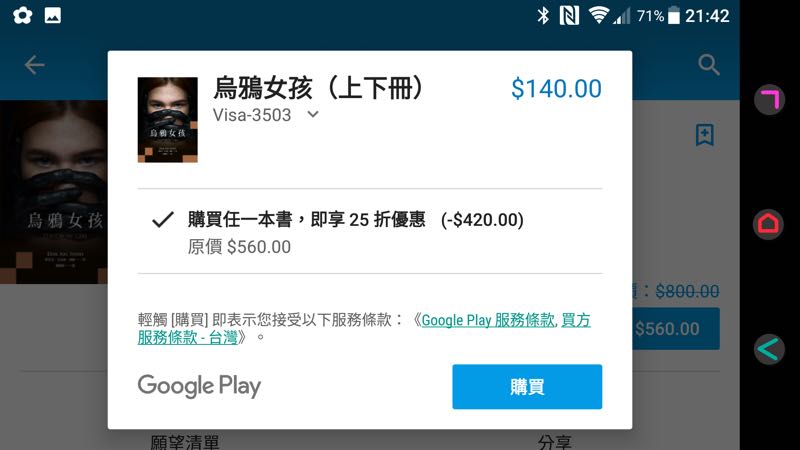 挑選書籍的時候除了能夠使用搜尋直接找尋以外,Google Play 「圖書」中也有分類能夠讓用戶直接挑選喜愛的類別來慢慢瀏覽。當看到喜歡的書籍就能直接進行購買。不過雖然點進去書本時看到的價錢只會是一般的折扣價格,但大家可以放心的是在要進行結帳時,系統就會以原先折扣的價格再打 25 折後來為你進行結帳。