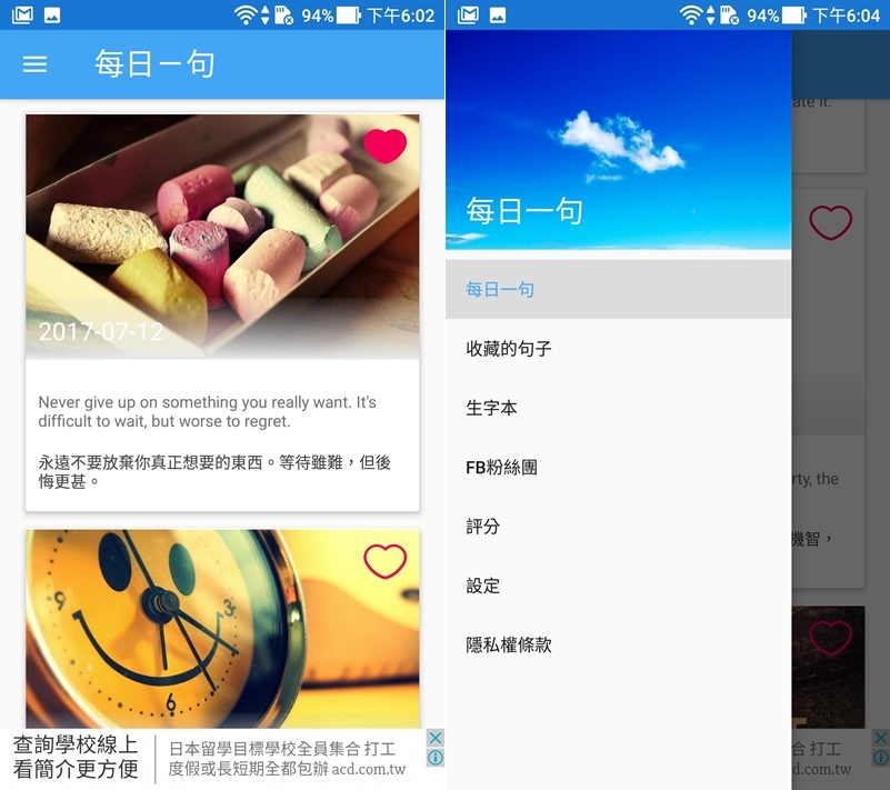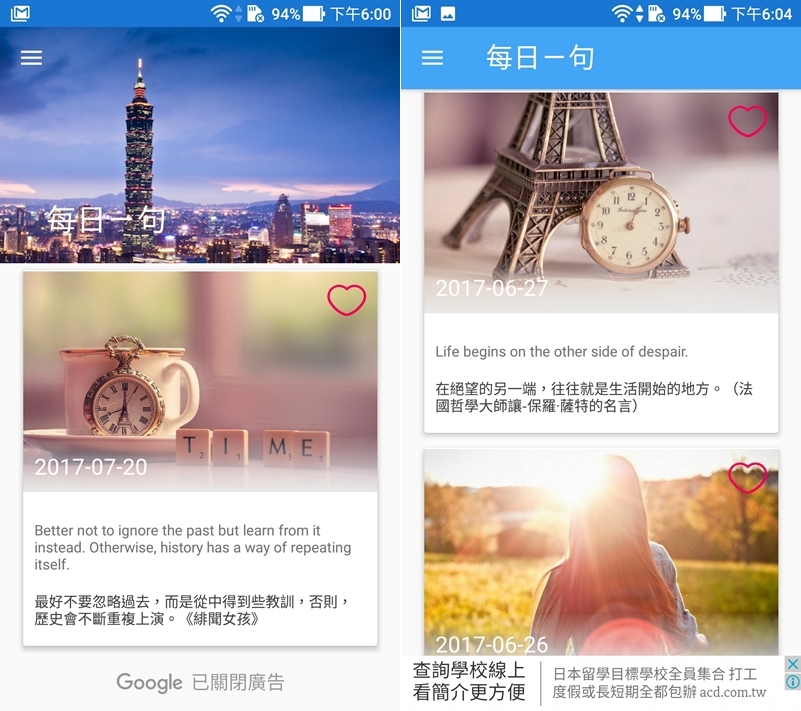介面很簡單,一張美美的底圖搭配中英對照的句子,並標示來源,往下滑是之前的日期,可以看到發表過哪些句子,喜歡就點右上角愛心收藏。