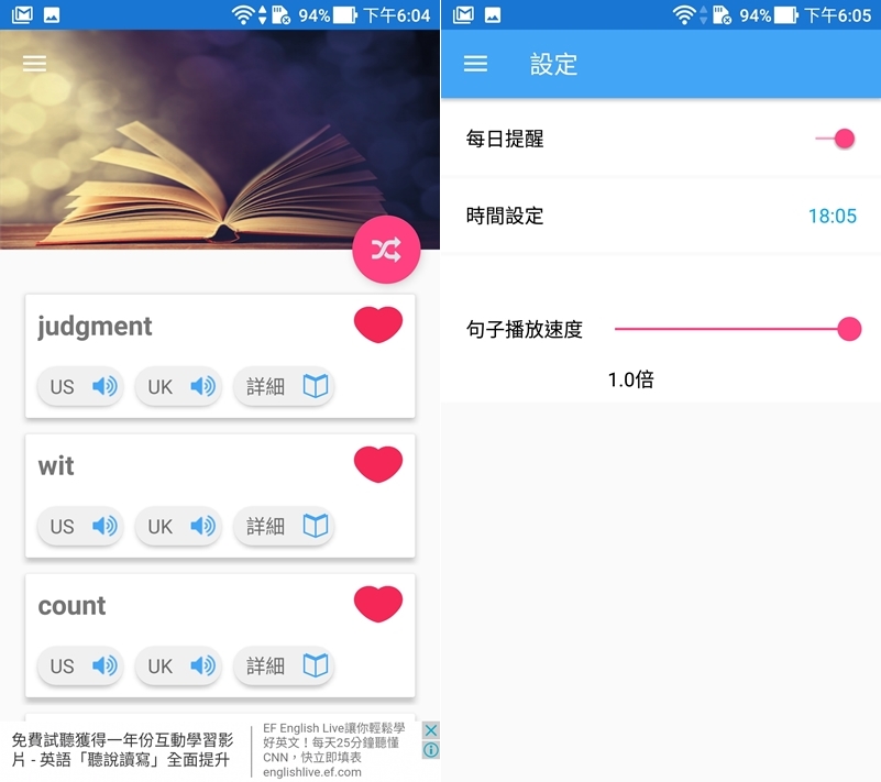 單字部分以發音為主,點「詳細」才會看到翻譯,頁面比較不會那麼雜亂,預設的語速蠻快的,建議在「設定」的地方更改。