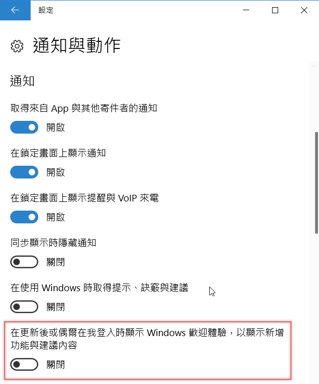 首頁 › 電腦小教室 › 如何讓 Windows 10 系統更新之後,不再跳出歡迎畫面 如何讓 Windows 10 系統更新之後,不再跳出歡迎畫面 發佈日期:2017/7/30 作者:阿湯 分類:電腦小教室 Windows 10 真的蠻多不需要的多餘功能或設定,例如每次更新完後一再出現的歡迎畫面,有時候還附帶這次更新了哪些內容,或只是登出再登入帳戶也會出現類似的畫面,生怕大家不會用似的,更何況有些時候會剛好在這裡當機,在更新中什麼都無法做的情況下只好重開機…這些 Windows 10 的「貼心」服務其實都可以關閉的,就讓阿湯來告訴大家去哪裡調整。 如何關閉更新後的歡迎畫面? 打開左下角設定,到「系統」。 再到「通知與動作」。 這裡就可以開啟或關閉一些不重要的通知,將「在更新後…」這個選項關閉,這樣就不會再跳出來了,也縮減更新完重新進入桌面的時間。 同一頁往下滑可看到「取得來自這些寄件者的通知」,底下是一些裝過的程式,如果覺得不需要也可以關閉通知,像 OneDrive 經常跳出來阿湯也覺得很煩,就關了吧。