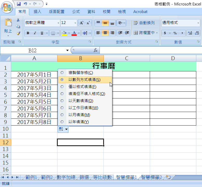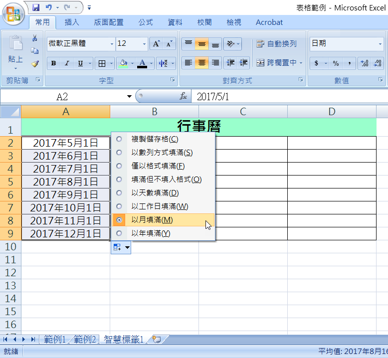 首頁 › 電腦小教室 › Excel 小教室 - 如何在複製資料時利用「智慧標籤」修改儲存格類型? Excel 小教室 - 如何在複製資料時利用「智慧標籤」修改儲存格類型? 發佈日期:2017/7/31 作者:阿湯 分類:電腦小教室 如果要做一份行事曆或是業績表、出貨表之類,都可能要用到重複的月份或是日期,例如每月一號發薪水,如果要做成整年度的表格原始方式就是從 1 月 1 號打到 12 月 1 號,但其實我們有更快的方法,只要利用「智慧標籤」就可以在複製儲存格的時候,直接修改填滿的類型,以天數、工作日、月還是年來填滿都能選擇,比一格格輸入或複製起來再修改數字快多了。 如何使用智慧標籤? 例如下面這個行事曆,在輸入 2017 年 5 月 1 日後,我希望可以用每月的 1 號填滿。 從儲存格的右下角「+」號按住往下拉,如果是預設的以數列方式填滿,只能改變「日」前面的數字。 這時將右下角的智慧標籤點開,選擇「以月填滿」,儲存格中改變的就是「月」前面的數字,如下圖就是從 2017 年 5 月 1 日一直到 12 月 1 日。 更多 Office 相關教學:請點我