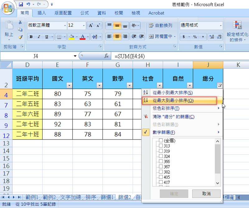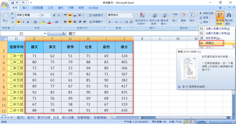 遇到這種大量數字的內容,可以在每一欄都設定篩選,作業的時候比較方便,像下面這個班級成績單,就全選所有科目包括總分欄位,然後在右上方排序與篩選的地方,點篩選。