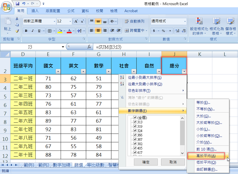設定好後,每個欄位最上面那格就會出現倒三角形的篩選功能鍵,接著就可以開始篩選,假設要用總分這一欄的內容,找出比平均分數高的是哪幾個班,就打開總分欄的篩選功能,點數字篩選 → 高於平均。