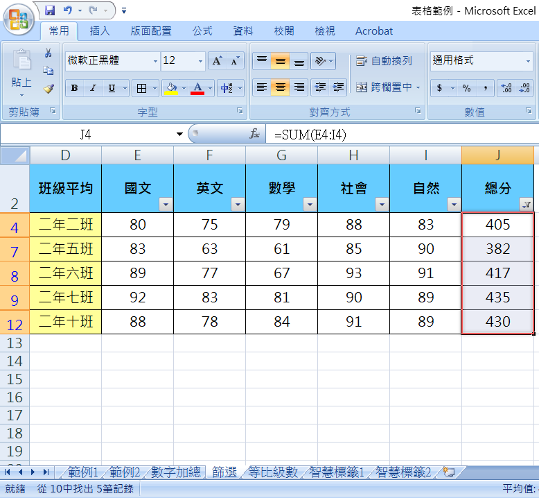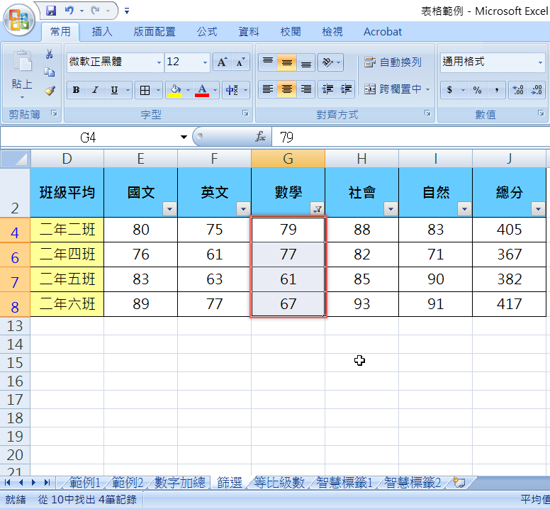 出來就是高於平均分的幾個班級了,由於只是篩選並沒要求排序,所以不會自動依分數排好,而是會依原本表格內的班級順序來顯示。