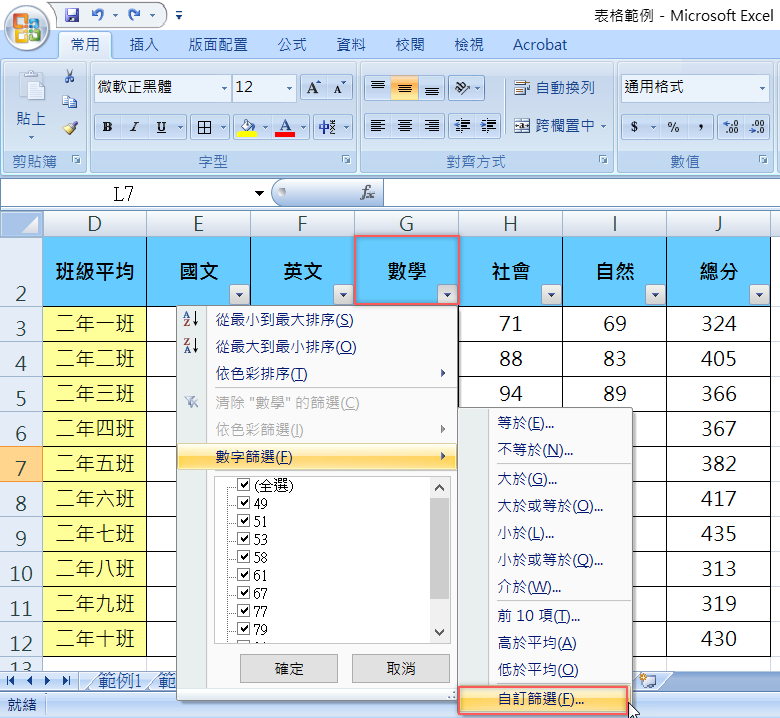 同樣是上面這份成績單,身為老師一定會想知道怎樣用不同模式來過濾出想知道的資訊,這時候就要自訂篩選,打開篩選功能,假設要看數學,就從數字篩選的地方,點最下面的「自訂篩選」。