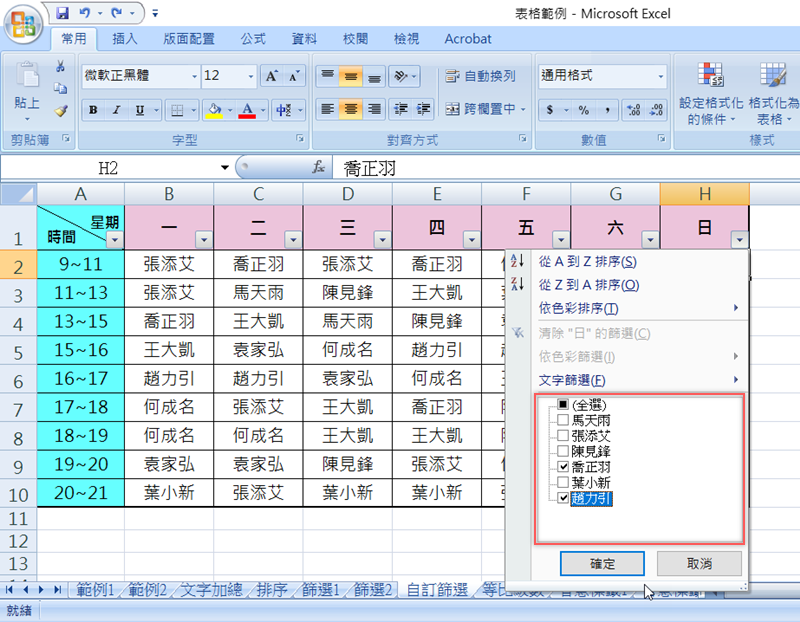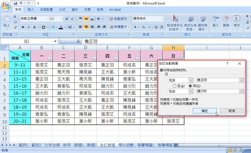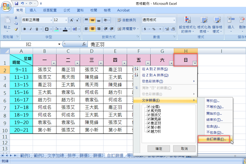 像這個例子其實也可以打開篩選清單後,直接在內容勾選要顯示的人名即可,但如果要進行更多設定,還是要自訂篩選囉。