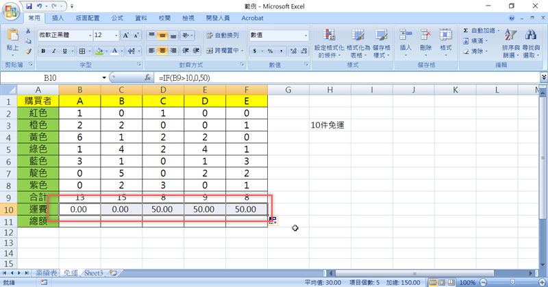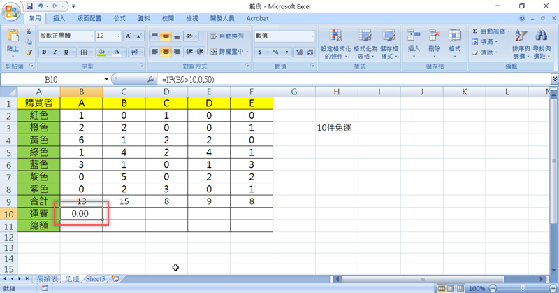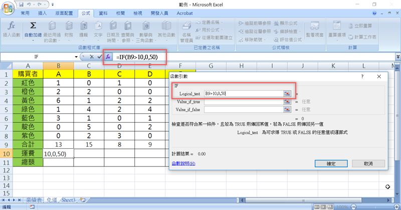 這個團購單假設大於 10 件免運費,就先點到運費那格,然後到公式頁面點「插入函數」,選擇使用「IF」函數就會出現輸入區,輸入條件「B9>10,0,50」代表合計這欄如果大於 10 件運費 0,否則就要加 50 元。