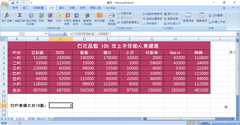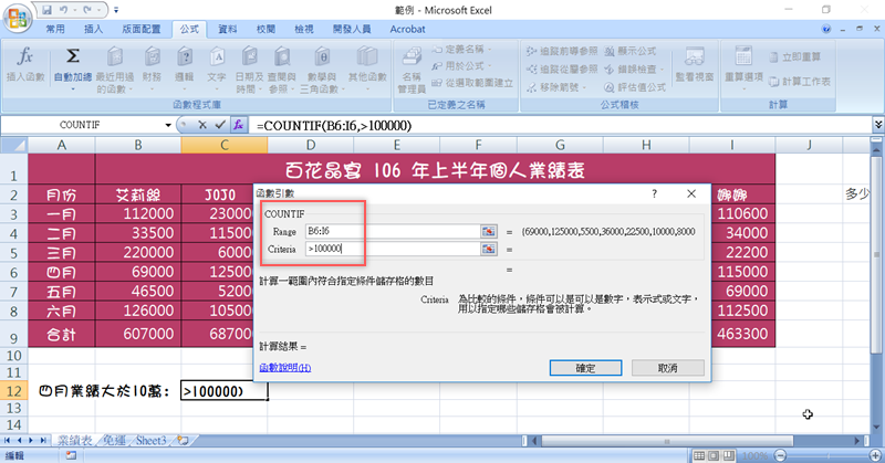 這次要看四月份業績大於 10 萬的有多少人,一樣插入函數,在 Range(範圍)輸入「B6:I6」Criteria(條件)輸入「>100000」,按確定。
