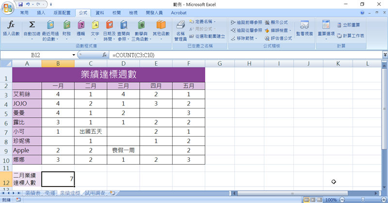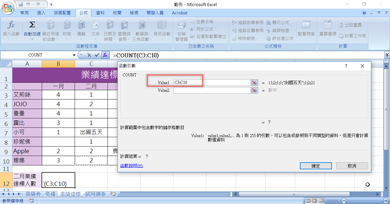 假設要算二月業績的達標人數,就在範圍輸入「C3:C10」點確定。