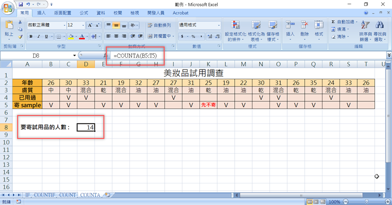 這次來算要寄試用品的人數,輸入範圍「B5:T5」,按確定。