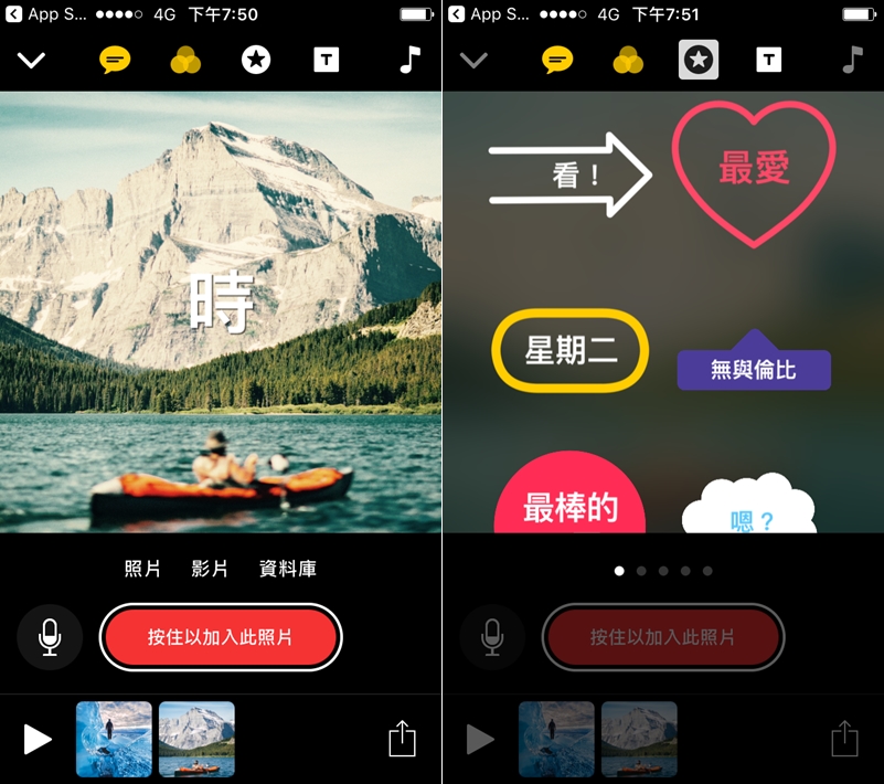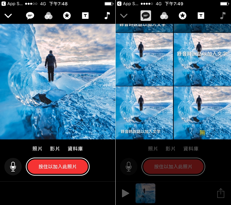再按住圖片可直接錄音,上方功能列也可套用濾鏡、加入圖案。
