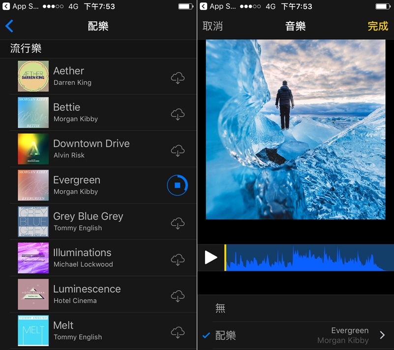 加入配樂讓內容更豐富,音樂庫內提供不少配樂,也可以用自己的,放進影片後再看要不要剪輯。