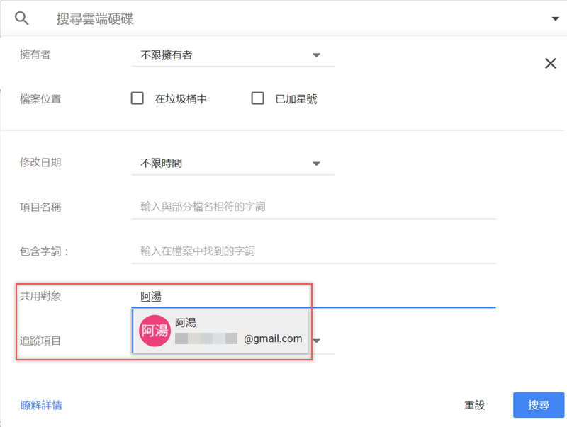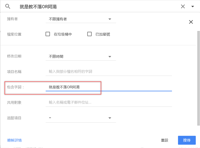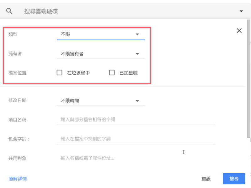 點開上方搜尋列的倒三角形,這裡可以看到不少條件可設置,基本的檔案類型、擁有者(自己還是他人建立)、檔案位置先試試看。