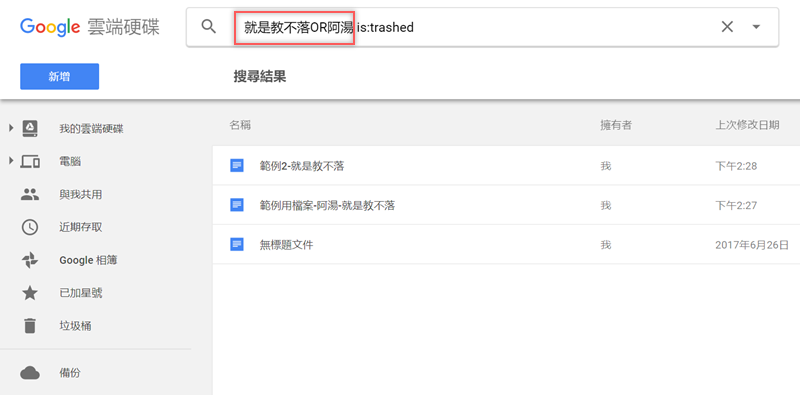 或是用「已加星號」的項目,輸入「is:starred」結果出現在垃圾桶,如果你的檔案很重要,記得加星號,找起來也比較快。
