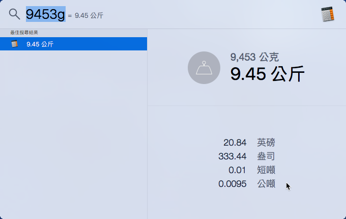 如果加上公克單位「g」,就會顯示換算成其他重量單位的結果,等於多少公斤、英鎊、盎司、短噸、公噸。
