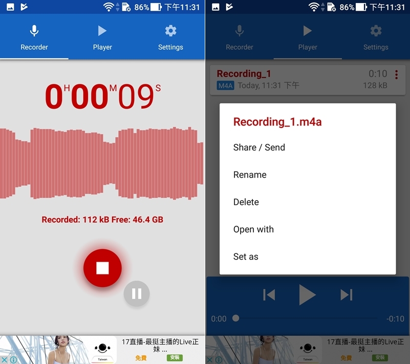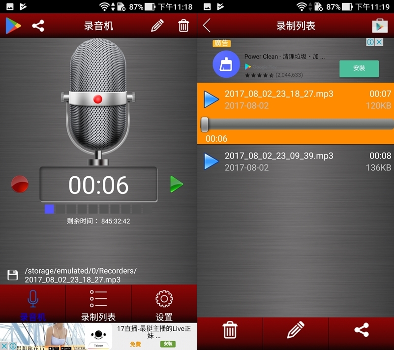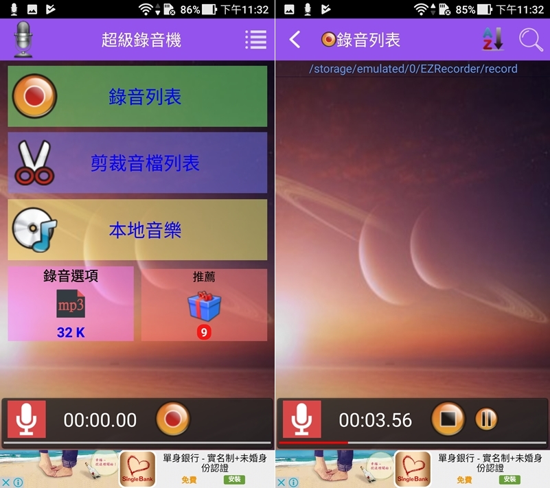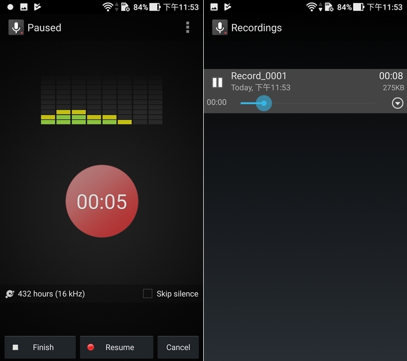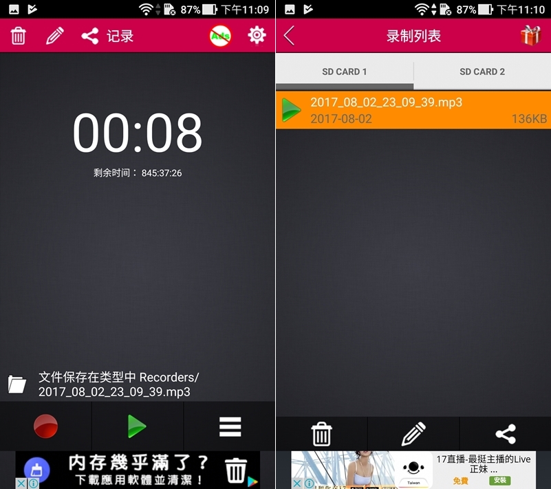 這類 APP 用起來多半非常直覺,首頁點圖示就開始錄,錄完自動儲存,像這款會顯示可錄製的剩餘時間並幫你存在 SD 卡,點 Play 鍵播放即可,聲音夠清,但如果放很大聲會有點雜音。
