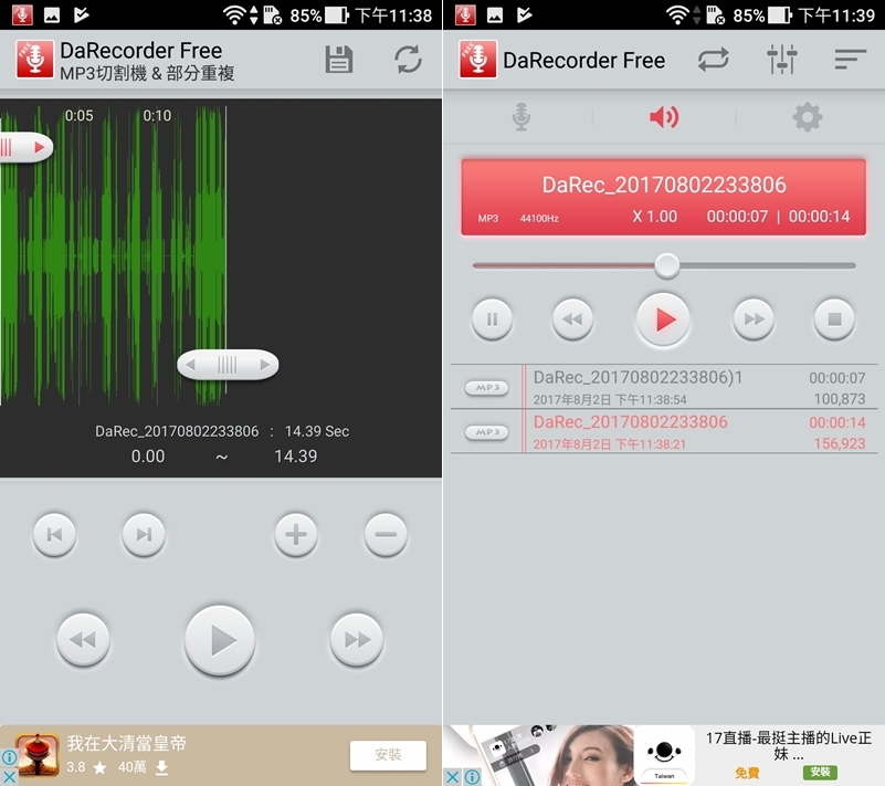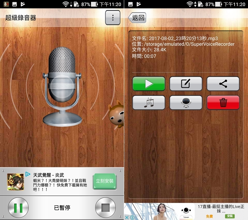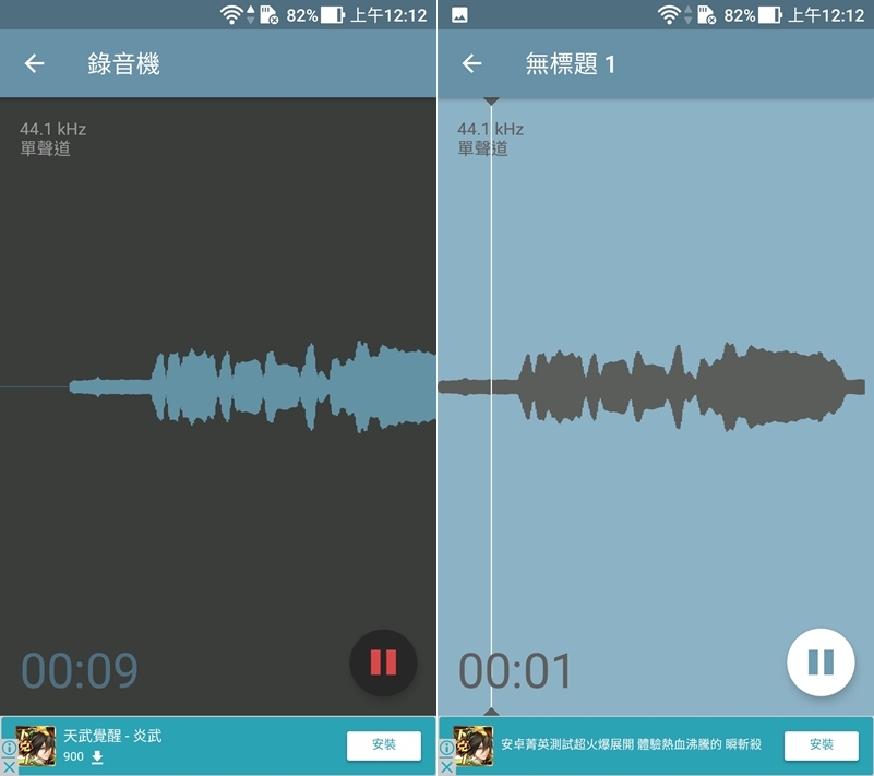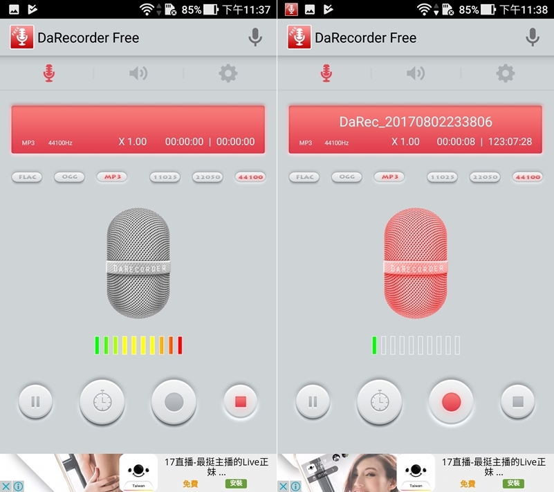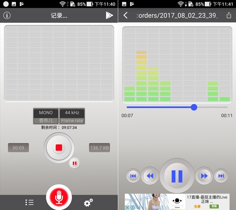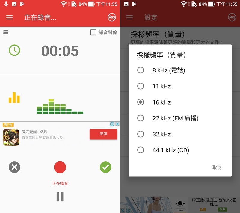 預設高清音質可調整,剩餘時間與空間也會同步,支援後台錄音,不過聲音有點小,雙版本。