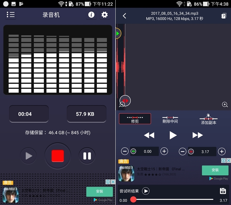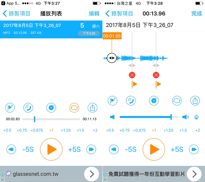 基本的錄音與剪輯功能都有,剪輯速度很快,檔案內容也很詳細。