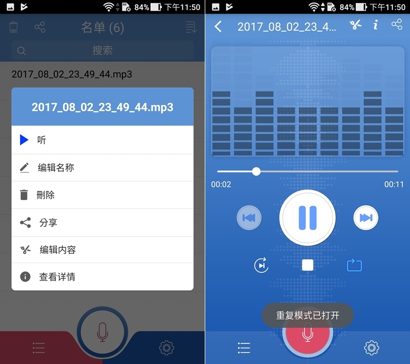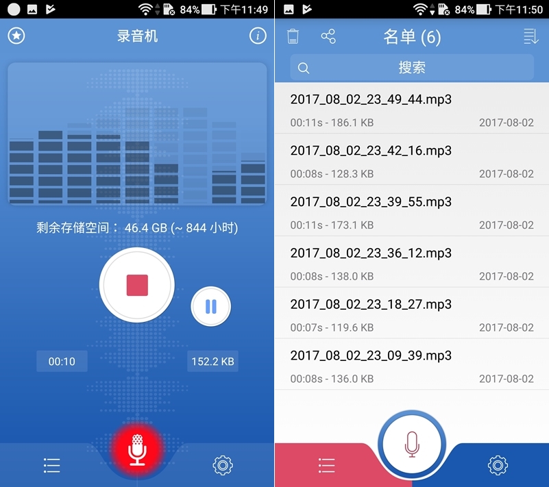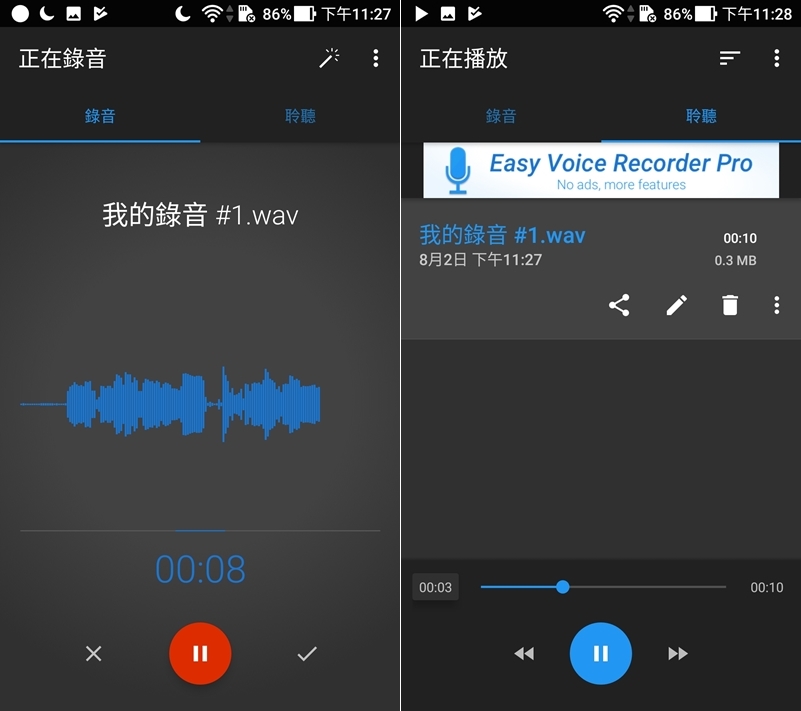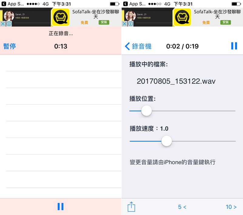 相較起來這款錄起來聲音比較大聲,但雜音也比較明顯,只有 MP3 格式,如果要剪輯要另外下載其他 APP 才行。