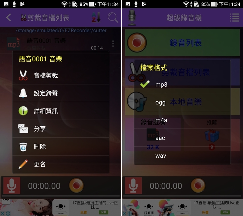 這款全中文可能比較親民(雖然設計有點醜)首頁有錄音列表、剪裁音檔列表與本地音樂選項,點錄音列表進入。