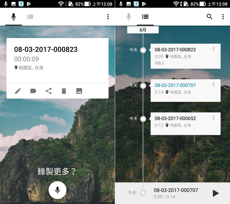 這款特別的是錄完可加入圖片,還會標示地點與檔案用途(個人、工作等),並以時間線顯示,噪音抑制、略過無聲與音量增益皆可調整。