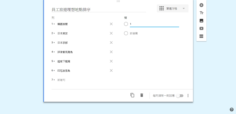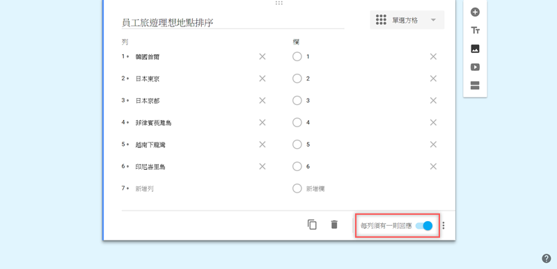 開啟「每列須有一則回應」避免有人少填或不填的情況。