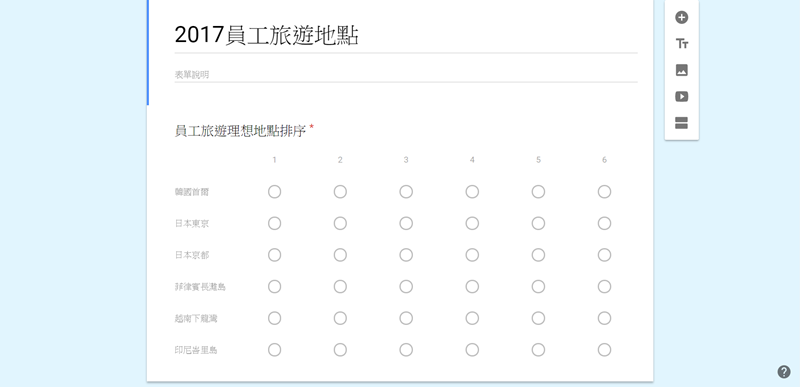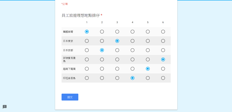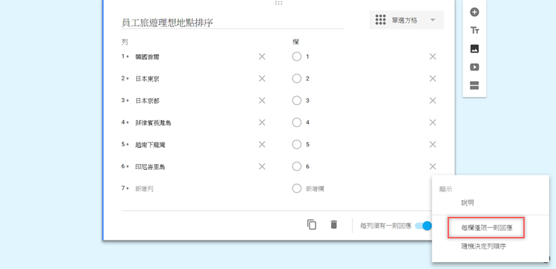 點進清單圖示再開啟「每欄僅限一則回應」,這樣如果有人心中有兩個同樣的名次,也一定要選擇誰先誰後才能繼續。