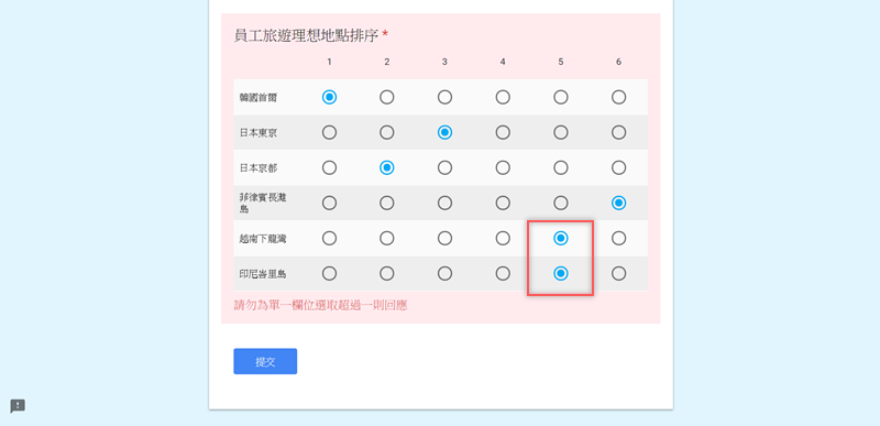 驗證一下,因為有開啟每欄限一則回應,如果多選就會出現錯誤訊息。