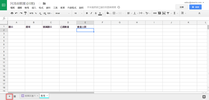 然後就會自動開啟一份試算表,在底下加入一個新標籤並命名,假設叫「整理」好了,並在表頭輸入顯示、選項、額滿顯示、已選數量、數量上限。