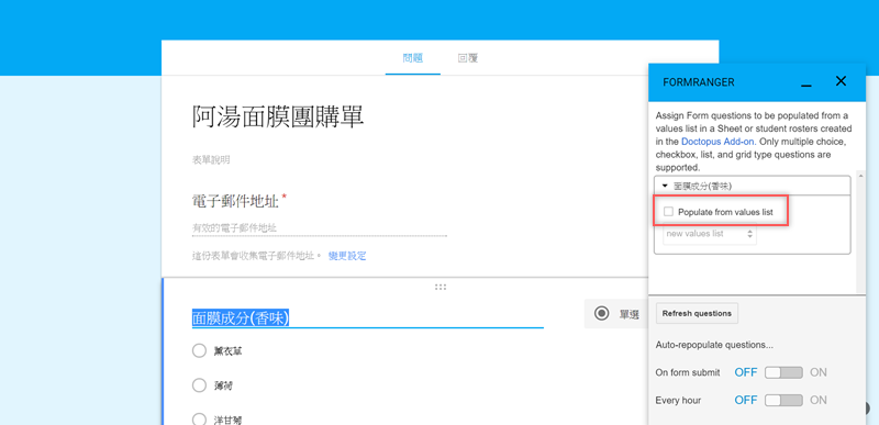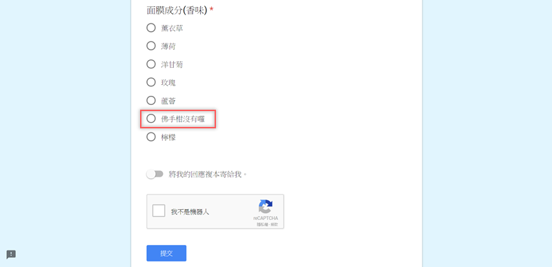 阿湯最近發現越來越多人使用 Google 表單在做網路購物,可能是一般大型購物中心都有門檻不然就是要繳刊登費,不如用臉書或 Line 來得親民又方便,昨天看到有人在搶購面膜,但每種成分的庫存數量都不一樣,例如薰衣草最受歡迎容易缺貨,賣家當然會希望網友們沒搶到薰衣草還可以選別的,這時我們除了設定表單是單選題,還要限制每個項目的被選次數,讓大家在填單的同時看到的都是最新資訊,以免發生糾紛。