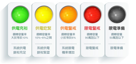 C、D、E、F 四組則是計畫性限電編組,當宣佈進入計畫限電階段時,將由 C 組開始分區限電,每輪 50 分鐘,等到 C 組輪完後換 D 組這樣類推下去。