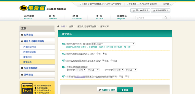 費用計算也是以長寬高合計的尺寸為基準,然後再加入性質與地區計費,另有便利箱及超值袋。