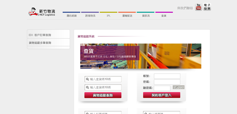 查件分貨物、國際、全球通、契約客戶,也有多筆查詢。另有進出口報關、農產品運銷、藥品醫材運銷等不同種類的服務。