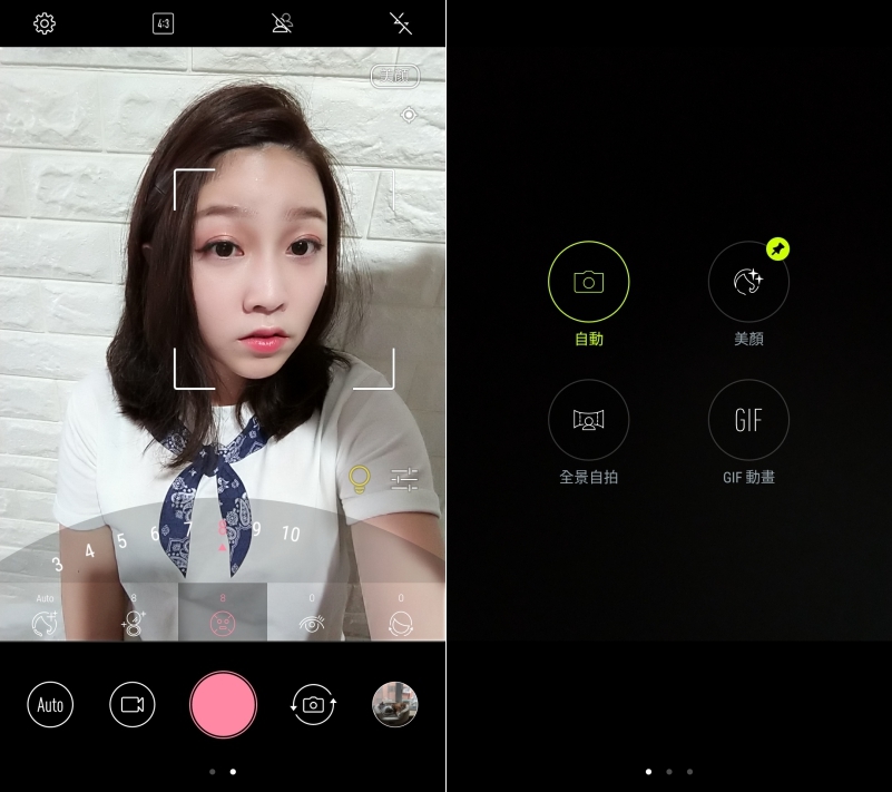 前鏡頭的部份,包括美顏模式、全景以及 GIF 動作拍攝,美顏模式包括柔膚、美白、大眼以及瘦臉可以調整,其實大概調到四的效果就已經相當不錯了。