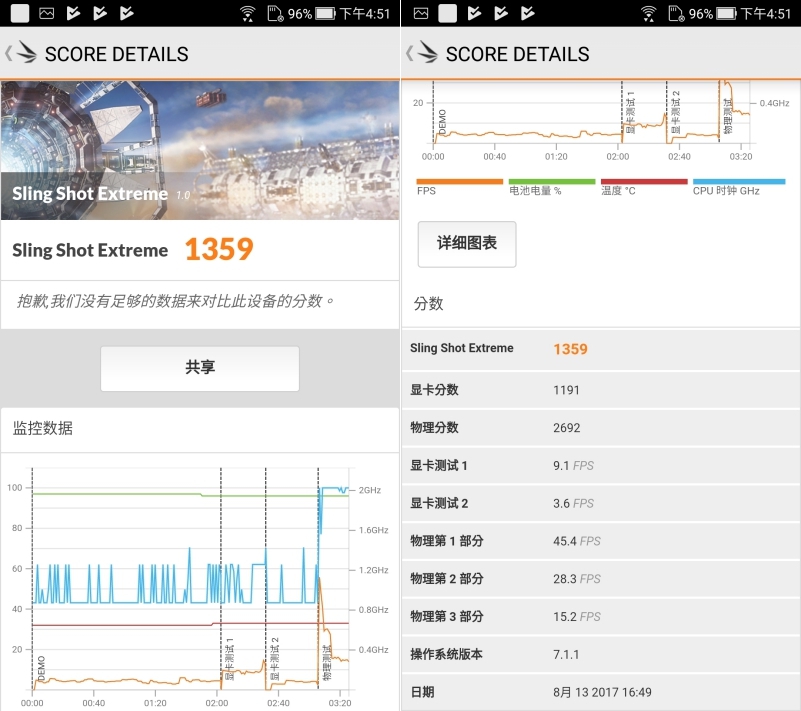 3DMark 透過 Sling Shot Extreme 測試獲得 1359 分。