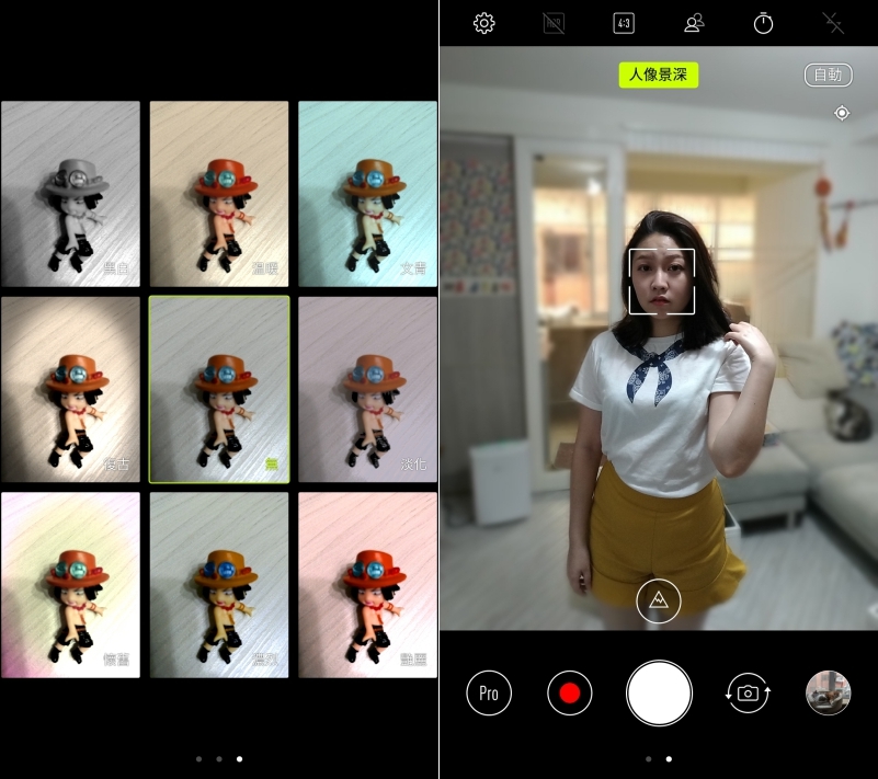 相機介面的操作也變的更加直覺,螢幕由左往右滑是各種拍攝模式,由右往左滑則是各種濾鏡,預設有九種濾鏡可以使用。如果愛拍攝人像的朋友,不妨也可以試試內建的人像景深模式,開啟後會自動深偵人臉並辨識邊緣自動創造出景深,讓人像拍攝看起來更加立體。