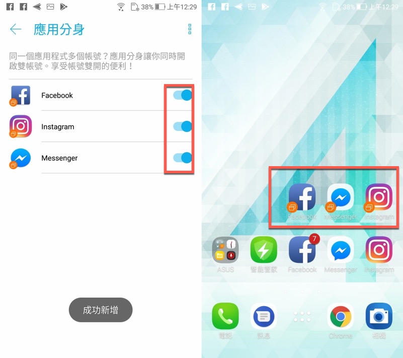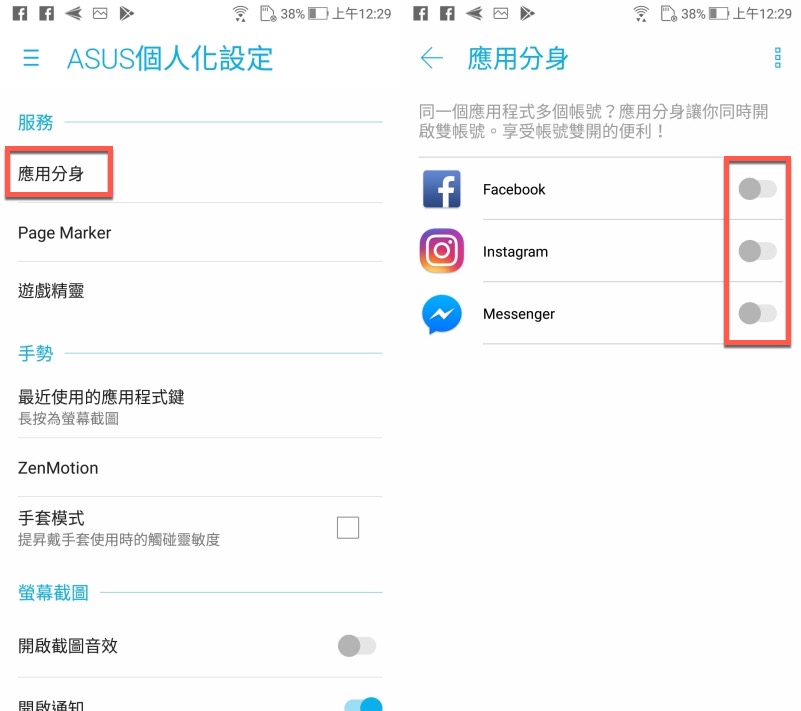 這次還有一個非常實用的功能就藏在設定 > ASUS 個人設定中,會看到有個「應用分身」,透過內建這項功能,就不需要透過第三方 APP,也不需 root 破解等,就能直接製作 Facebook、Instagram 及 Messenger 的 APP 分身,讓你同時登入二個帳號。